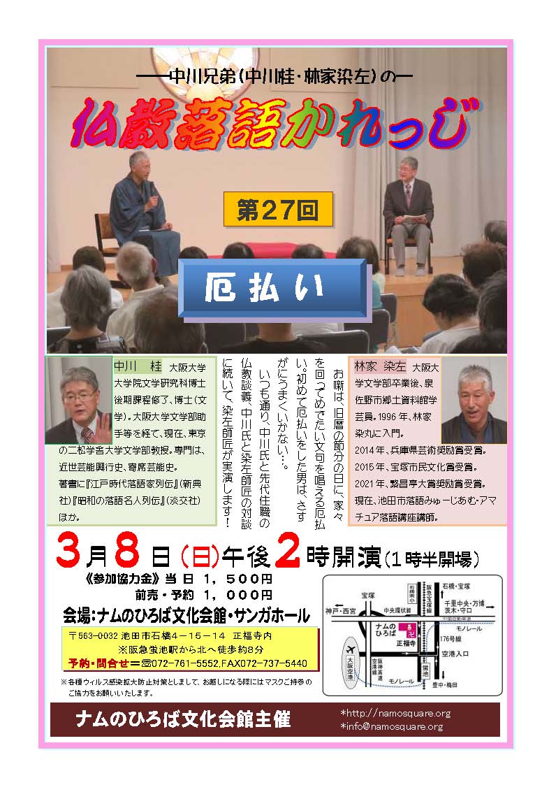 *仏教落語かれっじ 3月14日(日)午後2時~ 出演:中川桂氏、林家染左